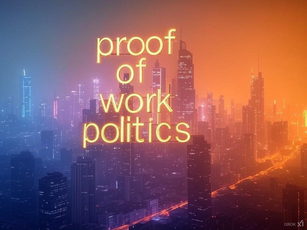 Proof of work is a useful concept from the cryptocurrency world that serves as a guarantee of digital scarcity. If politics is the sublimation of violence, alignment is the sublimation of politics. Jason Lowery in his book Softwar sees bitcoin as a global power projection tool through powergrids.